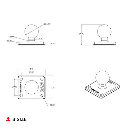 Specification: RAM Mounts Basisplatte rechteckig (2 x 1,7 Zoll) – B-Kugel (1 Zoll), AMPS-Lochraster