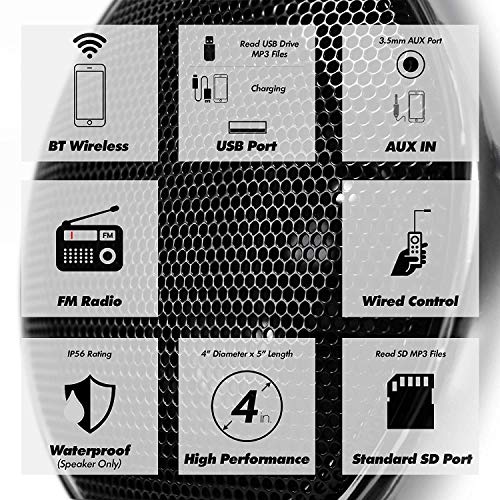 Superb Crystal Geluidskwaliteit. Geavanceerde IP56 Waterdicht Ontwerp (Speaker Alleen). Geweldig voor outdoor gebruik. Inbegrepen volledige functie wired controle. Inbegrepen 2x Externe Antenne voor Bluetooth en FM Radio. Eenvoudige Installatie: Wordt Geleverd met alle benodigde hardware en bedrading. Plug en Play. Standaard 12V Aansluiting.